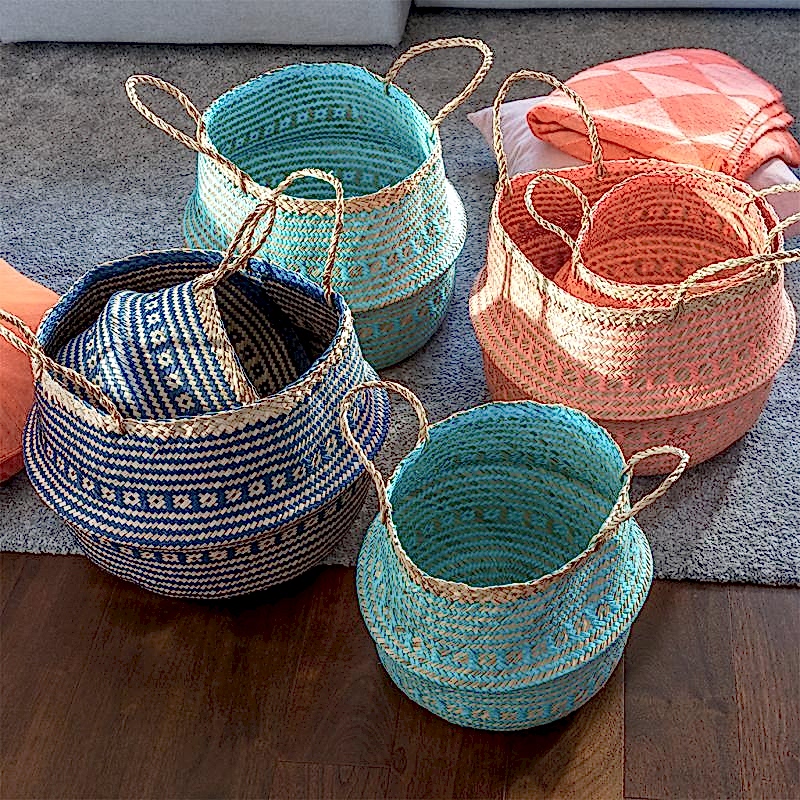 This large handwoven seagrass basket with a pop of coral is perfect for eye-catching storage in any room from the bathroom to the kids' playroom. You can use it two ways; turned up with handles for maximum storage size, or turned down to better display contents. Also available in a small size.